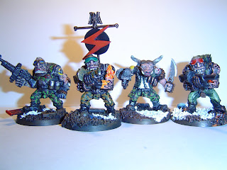 oK.4 OLD SCHOOL OGRYNS.The Wrecking Crew.The Boys.I had a lot of fun working on this squad.I think the head swap came out great on Mike!Wish the tattoos came out better.so it goes.I'll get it next time.I have a squad of 5 new style ogryn on the work bench.wow yeah